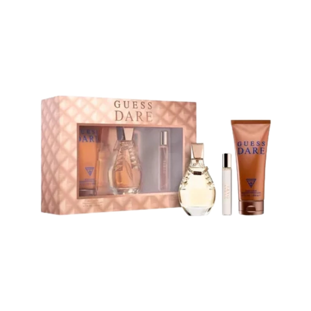Stay daring with the GUESS Dare 3 Pc Gift Set. This set includes 3.4oz EDT Spray, 0.5oz EDT Spray, and 6.7oz Body Lotion, giving you everything you need to experience the bold confidence of this iconic scent. With captivating notes of pink pepper, lily, and pear blossom, this gift set is perfect for the daring and adventurous.