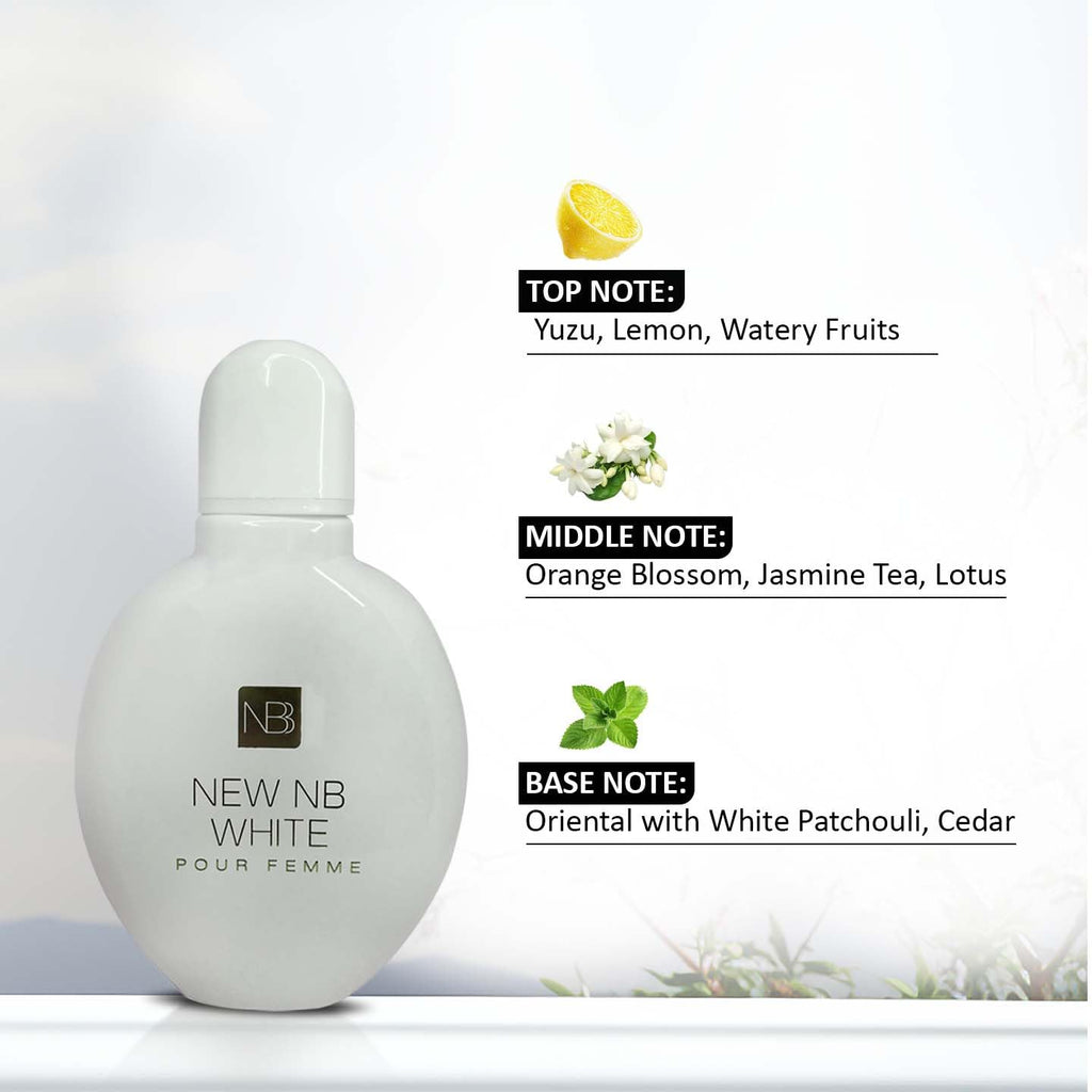 Discover the timeless charm of NB White Pour Femme, a beautifully balanced Eau de Parfum crafted for the modern woman who exudes grace and confidence. This captivating scent opens with fresh citrus and fruity notes, unfolds into a floral heart of jasmine and rose, and settles into a soft base of white musk and warm amber.