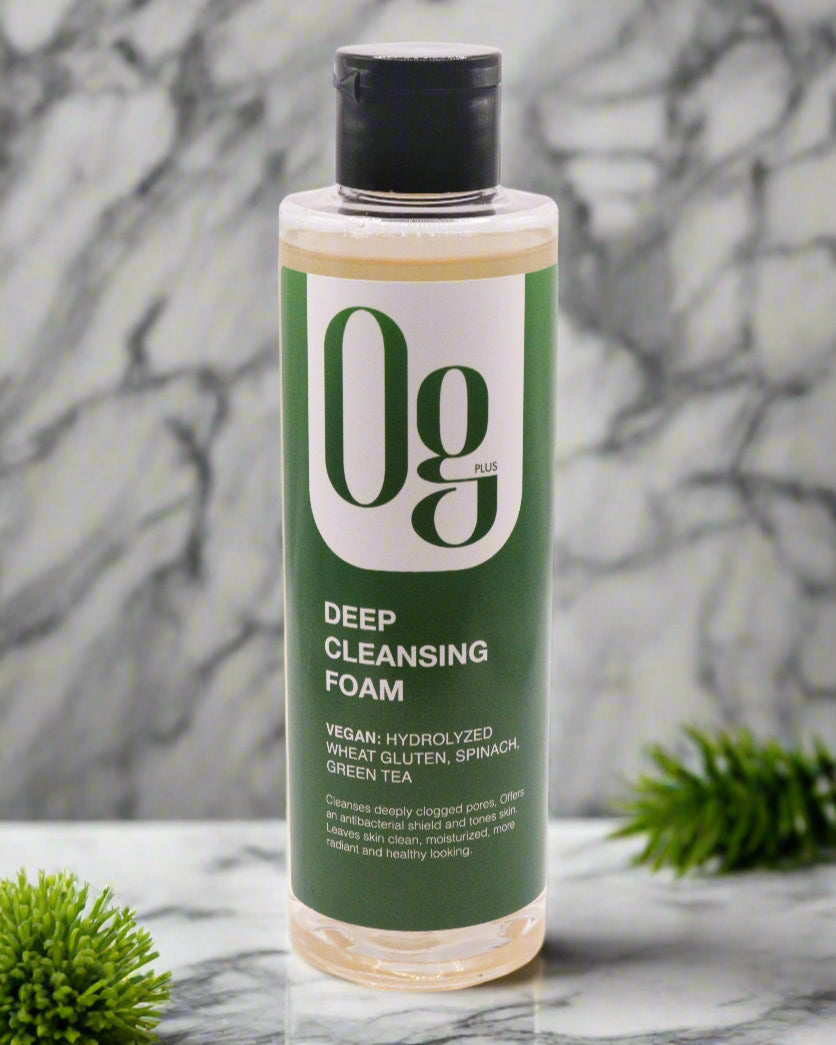 Refresh and rejuvenate your skin with Og Plus Deep Cleansing Foam. This vegan formula features hydrolyzed wheat gluten, spinach, and green tea to cleanse deeply clogged pores, provide an antibacterial shield, and tone your skin. Experience clean, moisturized, radiant, and healthy-looking skin with every use.