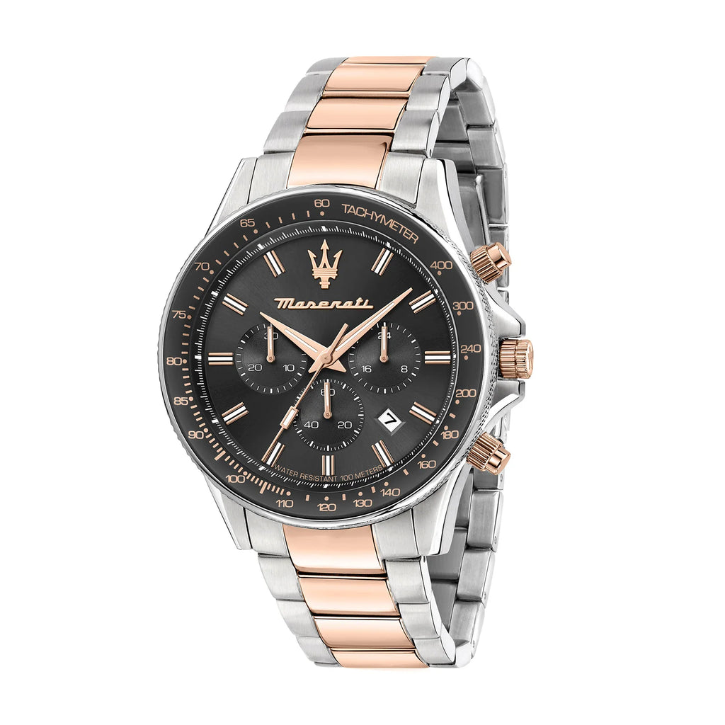 The Maserati Sfida R8873640021 is a luxurious and sporty chronograph designed for men who value Italian craftsmanship and contemporary style. Featuring a 44mm stainless steel case with rose gold accents and a sophisticated gray chronograph dial, this watch delivers precision, performance, and elegance in one striking design.