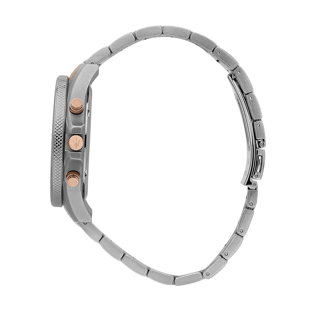Equipped with a chronograph movement, it provides accurate timekeeping along with stopwatch functionality, perfect for active lifestyles or motorsport enthusiasts. The stainless steel bracelet with rose gold highlights ensures durability while adding a refined, premium finish. Inspired by Maserati’s racing heritage, the Sfida combines performance-driven design with timeless Italian luxury.