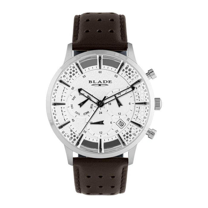 Upgrade your wristwear with the BLADE BARE WHITE 3673G1SSO Men’s Watch, a sophisticated blend of style and functionality. Crafted with a stainless steel case and a sleek leather strap, this watch ensures durability while offering a refined, modern look. The multifunction dial features date, day, and 24-hour subdials, combining practicality with contemporary design.