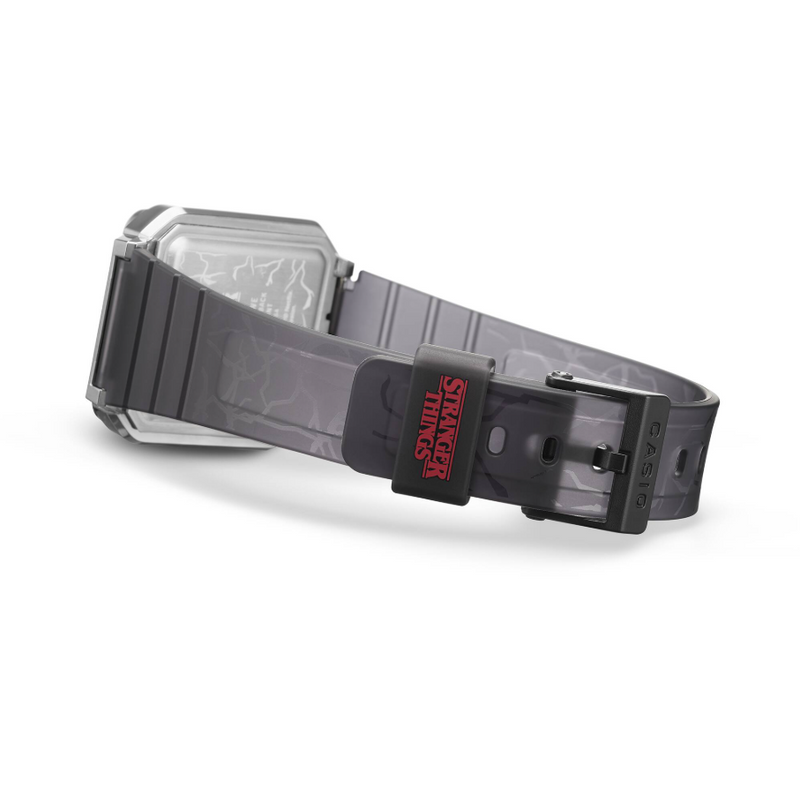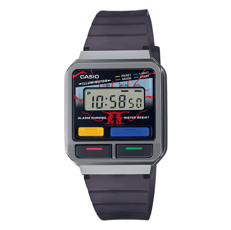 Paying homage to the show's 1986 setting, this timepiece features a multi-colour face inspired by iconic '80s Casio designs, contrasted by the silhouette of the menacing Demogorgon and eerie vines creeping across the translucent band and case back. Press the LED button to trigger a blinking light effect that reveals the Stranger Things title — printed upside down in a nod to the show's infamous alternate dimension, the Upside Down.