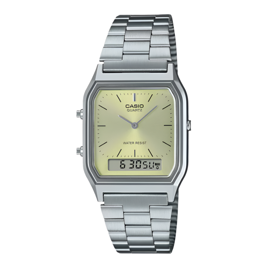 Elevate your everyday style with the CASIO AQ-230A-9AMQY Vintage Unisex Watch. Featuring a sleek gold-toned dial and the iconic analog-digital combination, this watch blends classic charm with reliable modern features. With functions like a daily alarm, stopwatch, dual time, and water resistance, it's built for convenience and durability. Designed to suit both men and women, this standout piece adds a touch of vintage sophistication to any look. Whether you're dressing up or keeping it casual, this watch is your go-to for effortless style with a nostalgic twist.